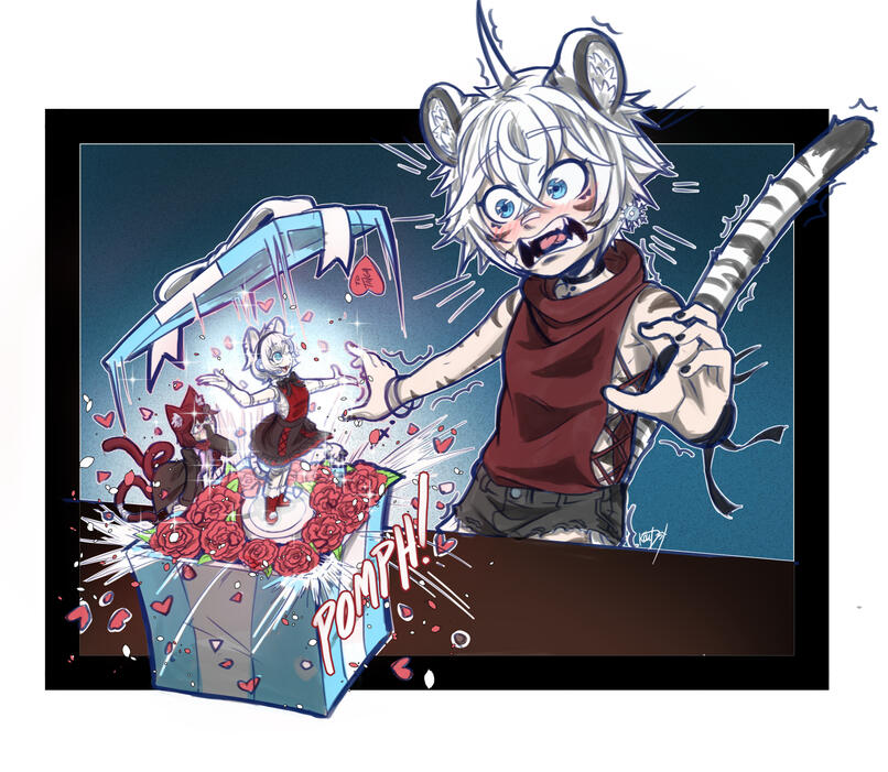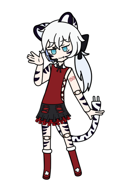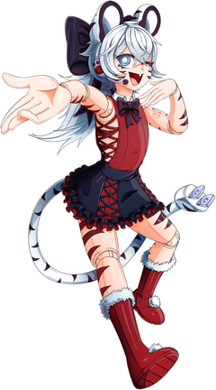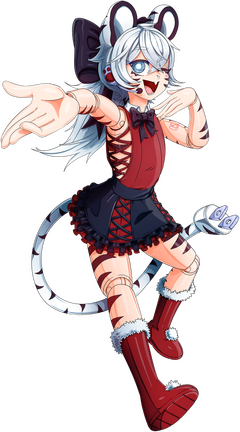 She wears a big black bow in her hair, a red dress with laced open sides, her own custom tiger paw headset, and red boots.