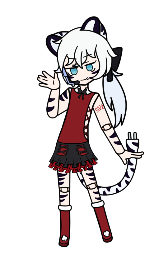 She wears a big black bow in her hair, a red dress with laced open sides, her own custom tiger paw headset, and red boots.